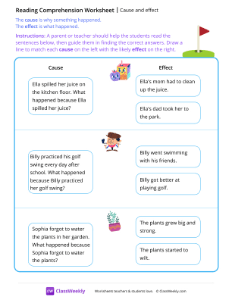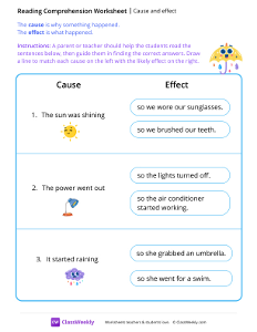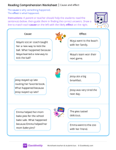 The cause is why something happened. The effect is what happened. Worksheet instructions: Instructions: A parent or teacher should help the students read the sentences below, then guide them in finding the correct answers. Draw a line to match each 'cause' on the left with its 'effect' on the right.