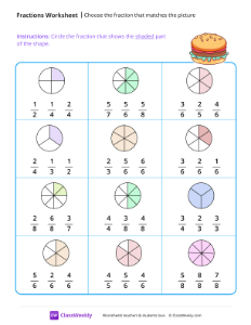 In this worksheet, students practice recognizing basic fractions like 1/2 and 1/3 by identifying shapes divided into equal parts. They select the shape that represents the given fraction. Worksheet instructions: Circle the correct shapes in each row.