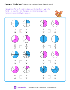 Worksheet instructions: For each problem below, write less than (<), greater than (>), or equal to (=) in the space provided to compare the fractions represented by the shapes.