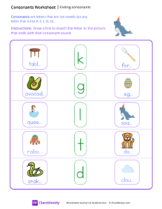 Consonants are letters that are not vowels (so any letter that is not A, E, I, O, U). Worksheet instructions: Draw a line to match the letter to the picture that ends with that consonant sound.