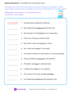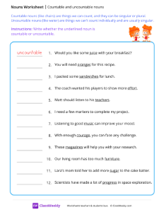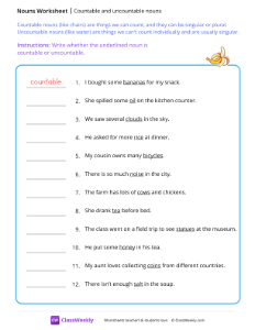 Countable nouns (like chairs) are things we can count, and they can be singular or plural. Uncountable nouns (like water) are things we can't count individually and are usually singular. Worksheet instructions: Write whether the underlined noun is countable or uncountable.