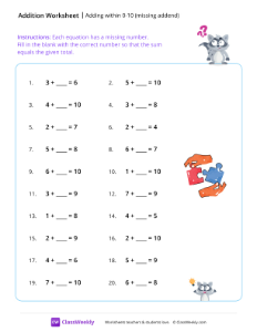 This worksheet helps students practice finding missing addends in equations with sums up to 10, strengthening mental math and basic addition skills. Worksheet instructions: Each equation has a missing number. Fill in the blank with the correct number so that the sum equals the given total.