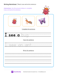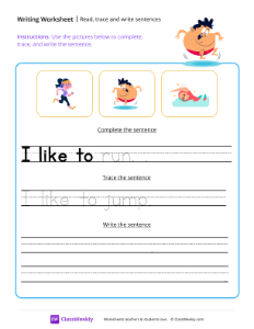 This worksheet has everything; sentence tracing, reading, and writing. Students trace, complete, and write simple sentences using picture cues. A great next step from our tracing sentences worksheets, they build handwriting, sentence structure, and word recognition skills. Worksheet instructions: