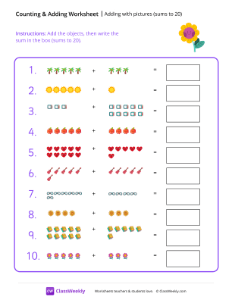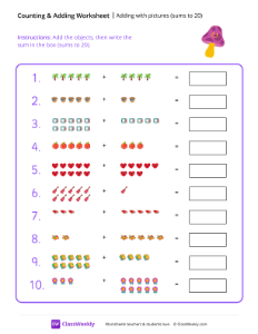 Worksheet instructions: Add the objects, then write the sum in the box (sums to 20).