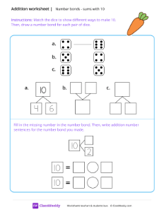 Worksheet instructions: Match the dice to show different ways to make 10. Then, draw a number bond for each pair of dice. Afterwards, fill in the missing number in the number bond. Then, write addition number sentences for the number bond you made.