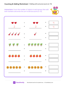 Worksheet instructions: Add the objects, then write the sum in the box (sums to 10).