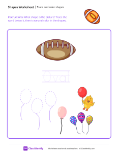 Worksheet instructions: What shape is the picture? Trace the word it, then trace and color in the shapes.