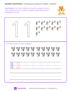 Worksheet instructions: Color the number and count the objects next to it. Then, color the correct number of objects shown and practice printing the number.