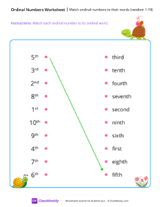 In this worksheet, students match ordinal words (ordered 1-10) with their corresponding ordinal numbers. Ordinal words (like first, second, third) describe the position of something in a sequence. Worksheet instructions: Match each ordinal word to its ordinal number.