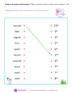 In this worksheet, students match ordinal words (random 1-10) with their corresponding ordinal numbers. Ordinal words (like first, second, third) describe the position of something in a sequence. Worksheet instructions: Match each ordinal word to its ordinal number.