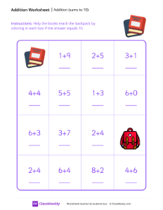 Worksheet instructions: Help the books reach the backpack by coloring in each box if the answer equals 10.