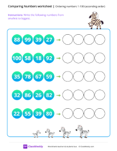 In this comparing numbers worksheet, students arrange numbers (1-100) in ascending order, from smallest to biggest. It is perfect for students to practice number recognition and place value. Worksheet instructions: Write the numbers from smallest to biggest.
