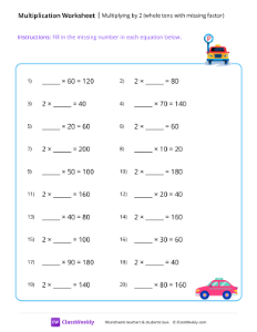 In this worksheet, students practice multiplying 2 by whole tens and find the missing factors. These exercises help strengthen their multiplication skills and understanding of factors and products. Worksheet instructions: Fill in the missing number in each equation below.