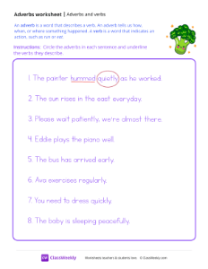 An adverb is a word that describes a verb. An adverb tells us how, when, or where something happened. A verb is a word that describes an action like play, eat and run. Worksheet instructions: Circle the adverbs in each sentence and underline the verbs they describe.