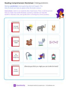 Making a prediction means guessing what will happen. The title of a book can help you guess what the book is about. Worksheet instructions: Listen to (or read) the title of each book. Then, circle the picture that you might see inside the book. A parent or teacher can help the students read each title, then guide them in finding the correct answers.