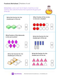 This worksheet helps students learn fractions by identifying and writing them to represent parts of a set or group of identical objects. Worksheet instructions: Look at each set of objects. Read the prompt carefully, then write the fraction that represents the given part of the set.