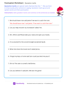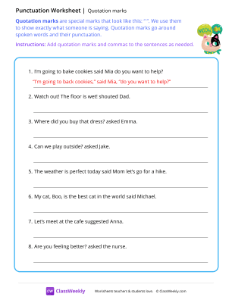 We use quotation marks to show what someone is saying. Quotation marks go around spoken words and their punctuation. Worksheet instructions: Add quotation marks and commas to the sentences as needed.