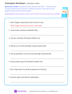 Quotation marks are special marks that look like this: “ ”. We use them to show exactly what someone is saying. Quotation marks go around spoken words and their punctuation. Worksheet instructions: Add quotation marks and commas to the sentences as needed.