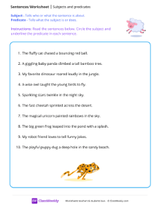Every complete sentence contains two parts: a subject and a predicate. The subject is what the sentence is about. The predicate tells something about the subject. Worksheet instructions: Circle the subject and underline the predicate in each sentence.