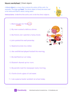 A direct object is a noun that receives the action of the verb. For example: The dogs eat food. The direct object is food; the word ‘eat’ is the verb and ‘food’ is what's being eaten. Worksheet instructions: Underline the verbs and circle the direct objects.