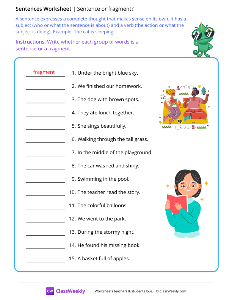 A sentence expresses a complete thought that makes sense on its own. It has a subject (who or what the sentence is about) and a verb (the action or what the subject is doing). Example: The dog is playing. Worksheet instructions: Write whether each group of words is a sentence or a fragment.
