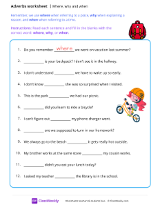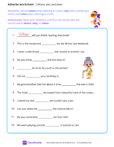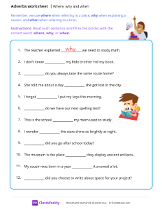 Students very often confuse between where, why, and when. In this adverbs worksheet, students select which of these adverbs to use in a each sentence. Worksheet instructions: Read each sentence and fill in the blanks with the correct word: where, why, or when.