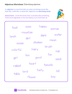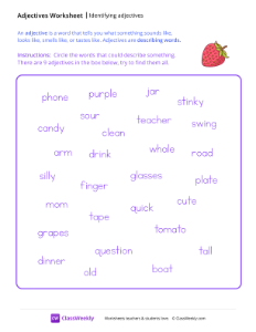An adjective is a word that tells you what something sounds like, looks like, smells like, or tastes like. Adjectives are describing words. Worksheet instructions: Look at the words and circle the ones that could describe something. Can you help us find 8 adjectives?