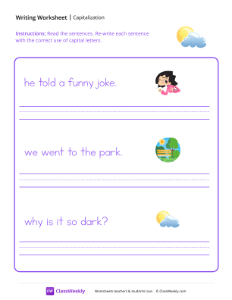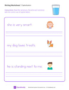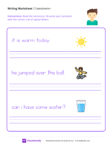 Worksheet instructions: Read the sentences. Re-write each sentence with the correct use of capital letters.