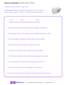 A noun is a person, place, thing or idea. Worksheet instructions: Find and underline the nouns in each sentence below. Write “person”, “place”, or “thing” above each noun.