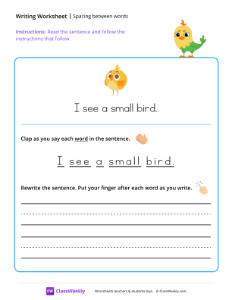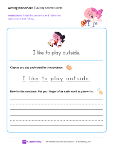 This writing worksheet helps students practice proper word spacing by reinforcing clear separation between words, both verbally and in writing, to improve readability and handwriting skills. Worksheet instructions: Read the sentence. Clap as you say each word in the sentence. Then, rewrite the sentence and put your finger after each word you write.