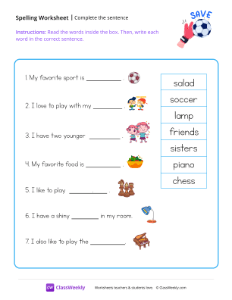 Worksheet instructions: Read the words inside the box. Then, write each word in the correct sentence.