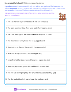 A simple sentence is a sentence with only one subject and predicate (The boy threw the ball). A compound sentence is two simple sentences joined by a comma and a conjunction such as and, or, but, or so (The boy threw the ball, and the girl caught it). Worksheet instructions: Combine each pair of sentences using a comma and the word in parentheses.
