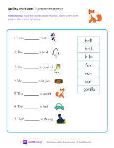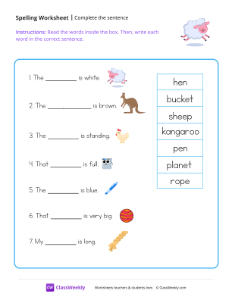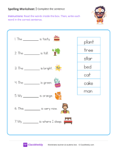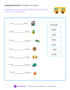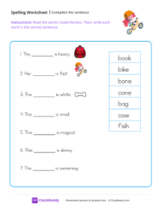 Worksheet instructions: Read the words inside the box. Then, write each word in the correct sentence.