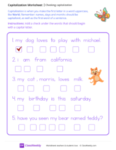 Capitalization is when you make the first letter in a word uppercase, like World. Remember: names, days and months should be capitalized, as well as the first word of a sentence. Worksheet instructions: Add a check under the words that should begin with a capital letter.