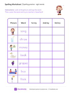 Worksheet instructions: Look at the picture and say the word. Then, cover the word and try to rewrite it. Good luck!