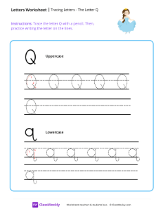 Worksheet instructions: Trace the letter Q with a pencil. Then, practice writing the letter on the lines (both in uppercase and lowercase forms).