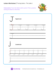 Worksheet instructions: Trace the letter J with a pencil. Then, practice writing the letter on the lines (both in uppercase and lowercase forms).