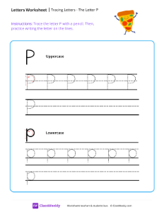 Worksheet instructions: Trace the letter P with a pencil. Then, practice writing the letter on the lines (both in uppercase and lowercase forms).