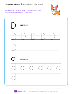 Worksheet instructions: Trace the letter D with a pencil. Then, practice writing the letter on the lines (both in uppercase and lowercase forms).