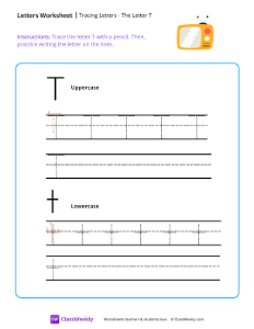 Worksheet instructions: Trace the letter T with a pencil. Then, practice writing the letter on the lines (both in uppercase and lowercase forms).