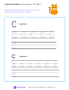 Worksheet instructions: Trace the letter C with a pencil. Then, practice writing the letter on the lines (both in uppercase and lowercase forms).