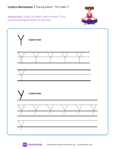Worksheet instructions: Trace the letter Y with a pencil. Then, practice writing the letter on the lines (both in uppercase and lowercase forms).