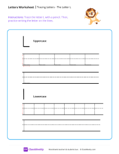 Worksheet instructions: Trace the letter L with a pencil. Then, practice writing the letter on the lines (both in uppercase and lowercase forms).