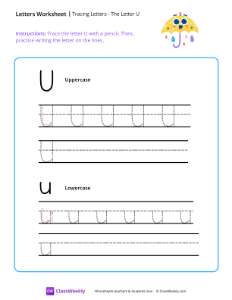 Worksheet instructions: Trace the letter U with a pencil. Then, practice writing the letter on the lines (both in uppercase and lowercase forms).