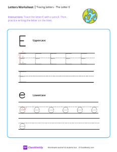 Worksheet instructions: Trace the letter E with a pencil. Then, practice writing the letter on the lines (both in uppercase and lowercase forms).