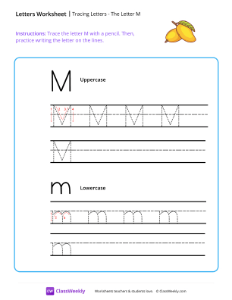 Worksheet instructions: Trace the letter M with a pencil. Then, practice writing the letter on the lines (both in uppercase and lowercase forms).