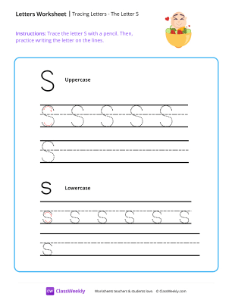 Worksheet instructions: Trace the letter S with a pencil. Then, practice writing the letter on the lines (both in uppercase and lowercase forms).
