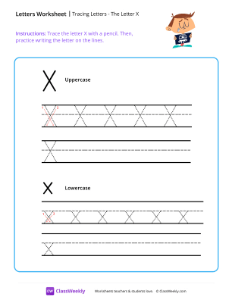 Worksheet instructions: Trace the letter X with a pencil. Then, practice writing the letter on the lines (both in uppercase and lowercase forms).