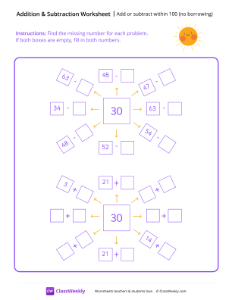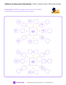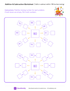 Worksheet instructions: Add or subtract to find the missing number for each problem.