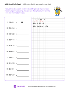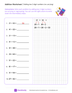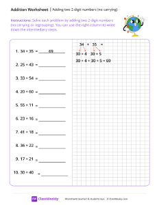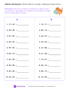 Worksheet instructions: Solve each problem by adding two 2-digit numbers (no carrying or regrouping). Try to figure out the answers mentally without writing down the steps.Solve each problem by adding two 2-digit numbers (no carrying or regrouping). Try to figure out the answers mentally without writing down the steps.